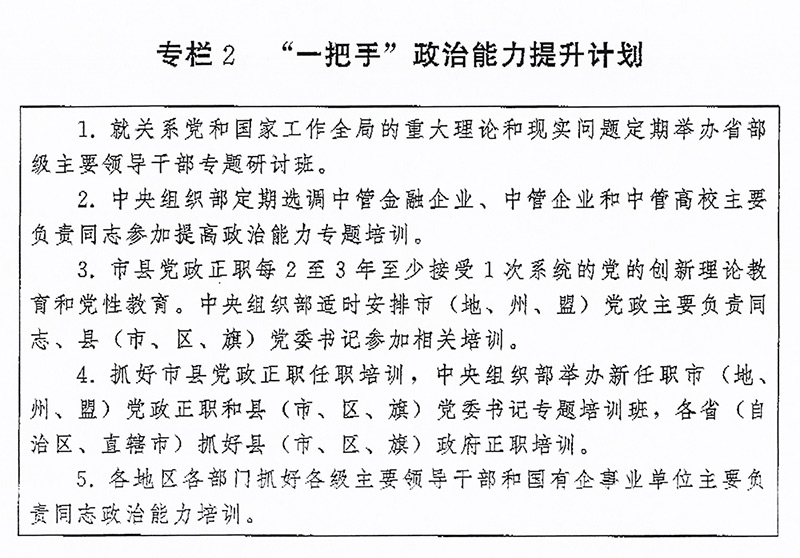 (二)突出“關(guān)鍵少數(shù)”政治訓練。堅持把政治訓練貫穿干部成長全周期,使干部的政治素養(yǎng)、政治能力與擔負的領(lǐng)導職責相匹配。強化“一把手”政治培訓,有計劃地選調(diào)地方、部門、國有企事業(yè)單位主要負責同志到黨校(行政學院)、干部學院參加專題培訓。實施“一把手”政治能力提升計劃(專欄2)。。ㄗ灾螀^(qū)、直轄市)、市(地、州、盟)、縣(市、區(qū)、旗)黨政領(lǐng)導班子成員每2至3年到黨校(行政學院)、干部學院至少接受1次系統(tǒng)的黨的創(chuàng)新理論教育和黨性教育,5年內(nèi)累計不少于2個月。圍繞提高政治能力和領(lǐng)導能力,加強機關(guān)司局長、處長任職培訓。重視對女干部、少數(shù)民族干部、黨外干部等的政治培訓。加強對高層次人才的政治引領(lǐng),中央組織部會同有關(guān)單位每年組織一定數(shù)量人才開展國情研修。