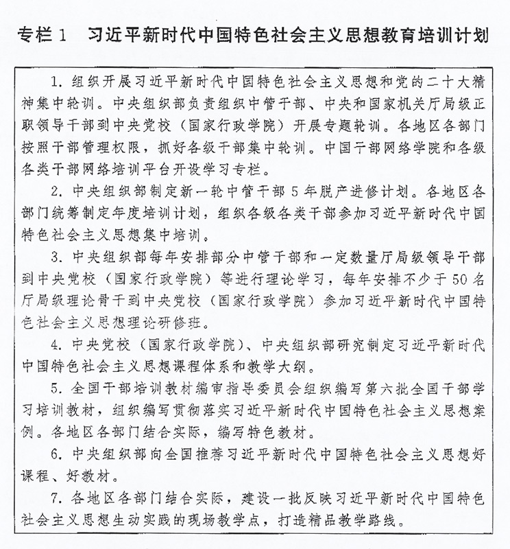 。ㄒ唬┚劢咕哿、久久為功。完善干部理論教育培訓長效機制,落實黨的創(chuàng)新理論學習教育計劃,組織實施習近平新時代中國特色社會主義思想教育培訓計劃(專欄1),系統(tǒng)謀劃、持續(xù)用力,不斷把思想鑄魂、理論武裝工作引向深入。堅持把習近平新時代中國特色社會主義思想作為黨委(黨組)理論學習中心組學習首要內(nèi)容,作出具體安排、精心組織實施;作為各級黨校(行政學院)、干部學院、社會主義學院主課必修課,辦好理論進修班、理論研修班;作為干部學習的中心內(nèi)容,全面系統(tǒng)學、持續(xù)深入學、聯(lián)系實際學。以縣處級以上黨員領(lǐng)導干部為重點,開展習近平新時代中國特色社會主義思想和黨的二十大精神集中輪訓;深入開展主題教育,通過專題學習、研討交流、主題黨課、調(diào)查研究、建章立制等形式,推動黨的創(chuàng)新理論學習教育走深走實走心,使廣大干部更加深刻領(lǐng)悟“兩個確立”的決定性意義,更加自覺增強“四個意識”、堅定“四個自信”、做到“兩個維護”。