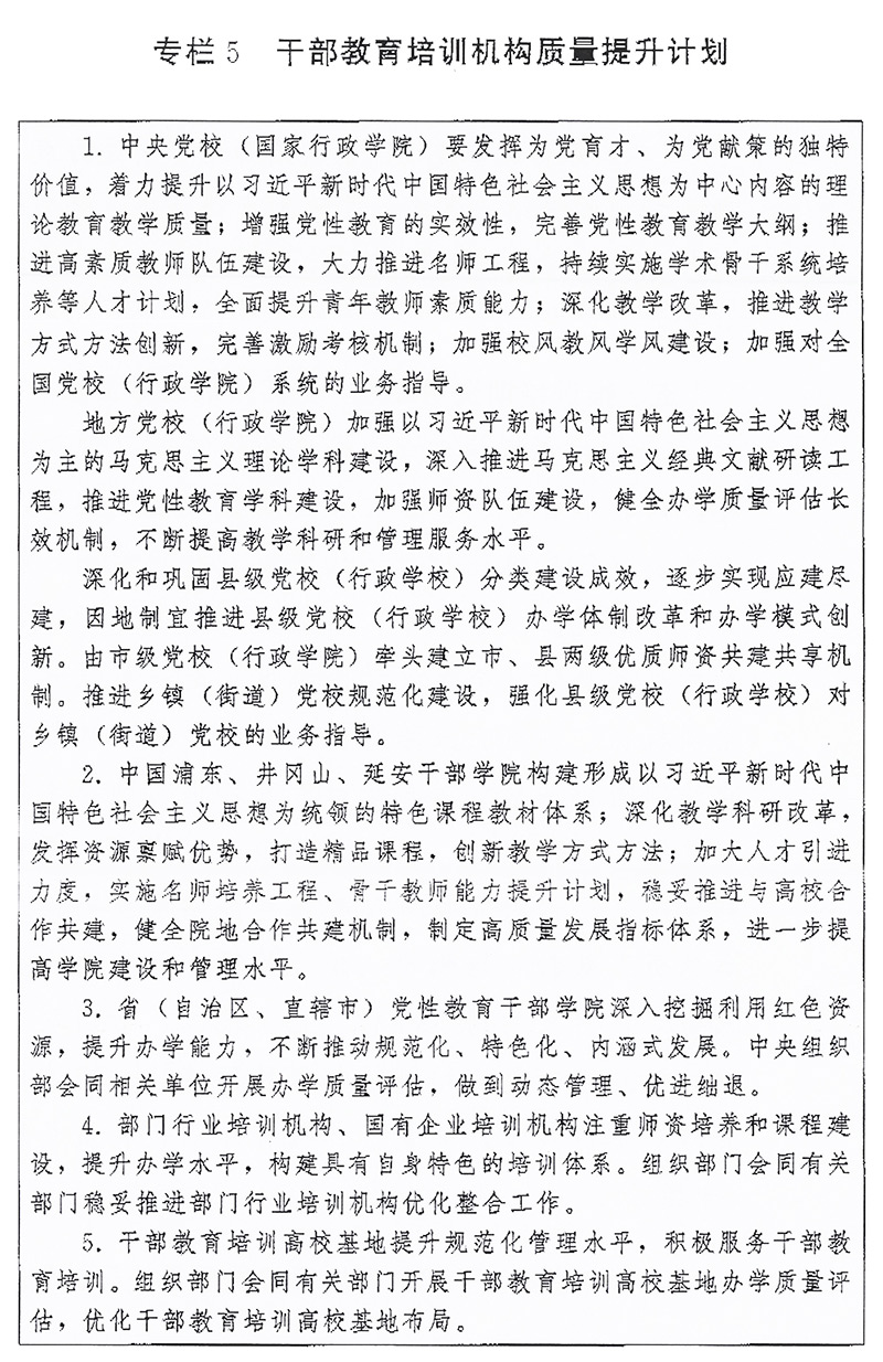。ㄒ唬┡嘤枡C構(gòu)建設(shè)。推進各級黨校(行政學院)建設(shè),以教學督導、師資培養(yǎng)、質(zhì)量評估為重點,強化上級黨校(行政學院)對下級黨校(行政學院)的業(yè)務指導,不斷提高辦學水平。推進縣級黨校(行政學校)分類建設(shè)。加強社會主義學院建設(shè)。進一步提升部門行業(yè)培訓機構(gòu)、國有企業(yè)培訓機構(gòu)辦學質(zhì)量。加強對干部教育培訓高校基地、基層干部教育培訓機構(gòu)辦學指導。開展黨校(行政學院)、。ㄗ灾螀^(qū)、直轄市)黨性教育干部學院、干部教育培訓高校基地辦學質(zhì)量評估。加強各類黨員干部教育培訓機構(gòu)規(guī)范管理,嚴控新設(shè)以黨員干部為培訓對象的培訓機構(gòu)。支持地方、部門聯(lián)合開展培訓,鼓勵干部教育培訓機構(gòu)開展區(qū)域協(xié)作交流,推動優(yōu)質(zhì)培訓資源共享。實施干部教育培訓機構(gòu)質(zhì)量提升計劃(專欄5)。