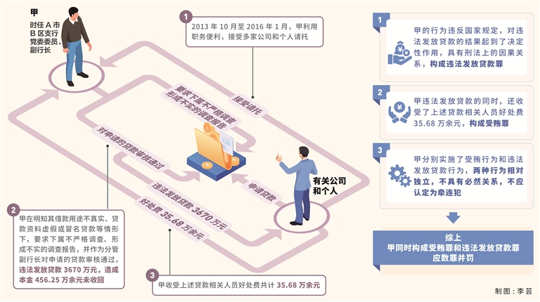 我們認(rèn)為,對(duì)于甲收受好處并違法發(fā)放貸款的行為,應(yīng)當(dāng)以受賄罪與違法發(fā)放貸款罪數(shù)罪并罰。一是甲分別實(shí)施了受賄行為和違法發(fā)放貸款行為,通常情況下,銀行工作人員違法發(fā)放貸款不必然要求其以受賄為手段,同理,即使銀行工作人員收受了賄賂,也不必然導(dǎo)致違法發(fā)放貸款,違法發(fā)放貸款行為和受賄行為相對(duì)獨(dú)立,不具有必然關(guān)系,不應(yīng)認(rèn)定為牽連犯。二是兩個(gè)行為侵害的法益不同,違法發(fā)放貸款罪侵害的法益是國(guó)家金融管理秩序及貸款秩序,其要義在于信貸資金的流動(dòng)性和安全性,受賄罪侵害的法益是國(guó)家工作人員職務(wù)行為的廉潔性和不可收買性,在不違反禁止重復(fù)評(píng)價(jià)原則基礎(chǔ)上,對(duì)行為侵犯的每個(gè)法益均應(yīng)當(dāng)進(jìn)行評(píng)價(jià)。故甲同時(shí)構(gòu)成受賄罪和違法發(fā)放貸款罪,應(yīng)數(shù)罪并罰。