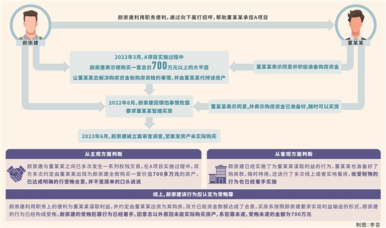 本案中,顏崇建利用職務(wù)上的便利為董某某承攬環(huán)衛(wèi)項目提供幫助,并約定由董某某出資為其購買一套房產(chǎn),因顏崇建被查處,房產(chǎn)尚未實際購買,該行為如何定性?